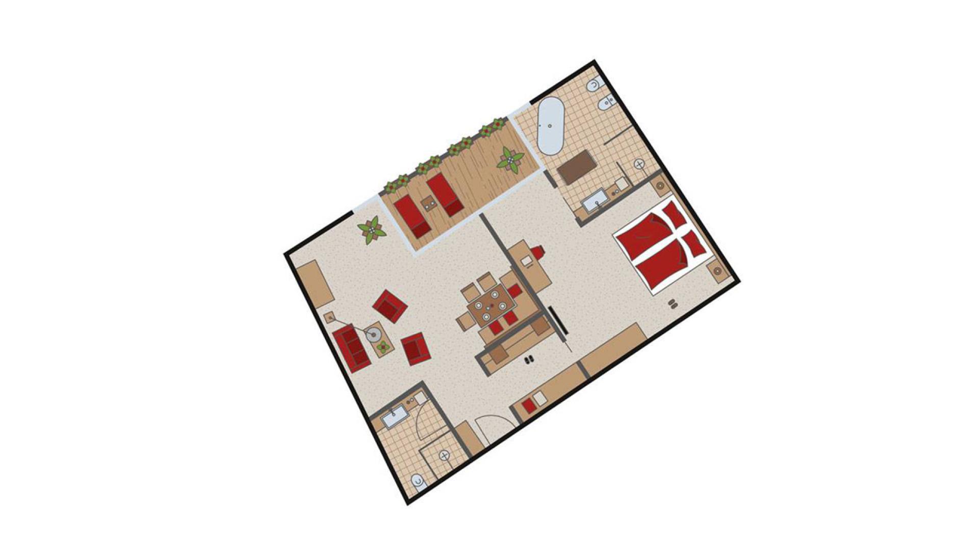 2-room suite of about 80m², separated living and sleeping area, 1 large and 1 small bathroom with rain shower, WC and bidet, flat-screen Sat-TV, telephone, safe, in-room espresso machine and electric kettle, south-facing “loggia”, Wi-Fi and underground parking lot.
