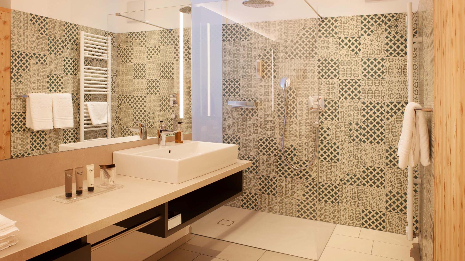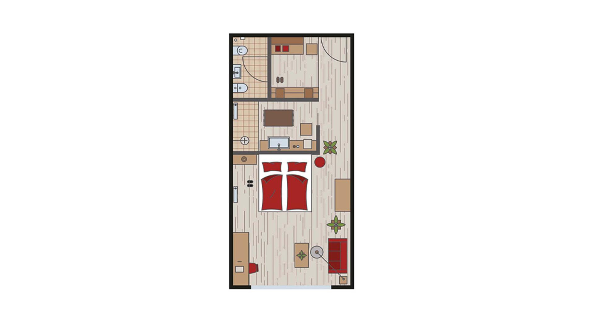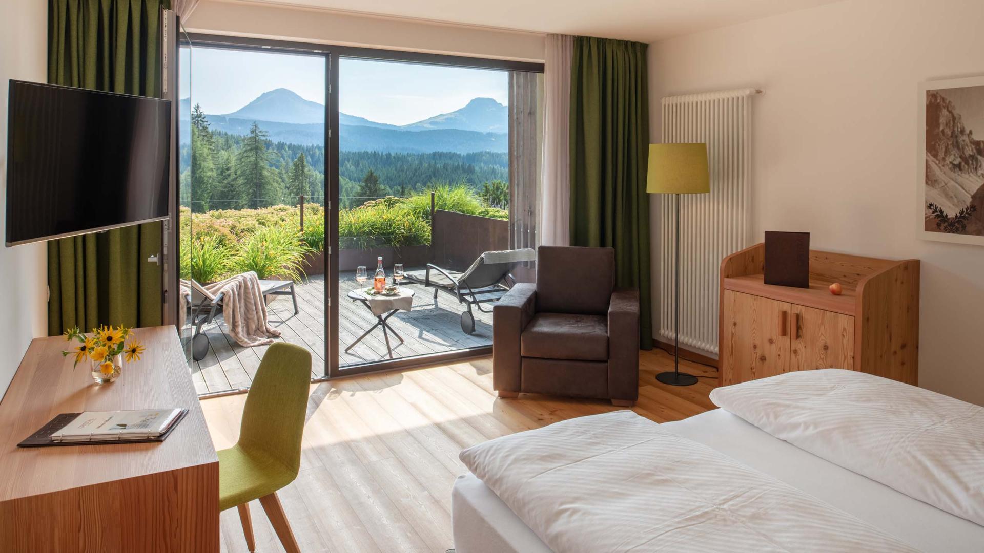 Ampia, confortevole camera doppia in legno di larice, di circa 38 m², 1 bagno con doccia, WC e bidet a parte, TV satellitare a schermo piatto, bollitore in camera, telefono, cassaforte, balcone rivolto al sud, WiFi e parcheggio interrato.