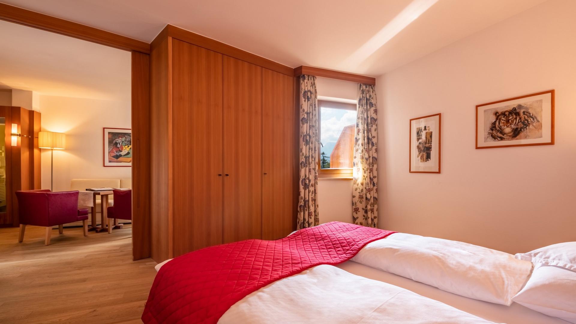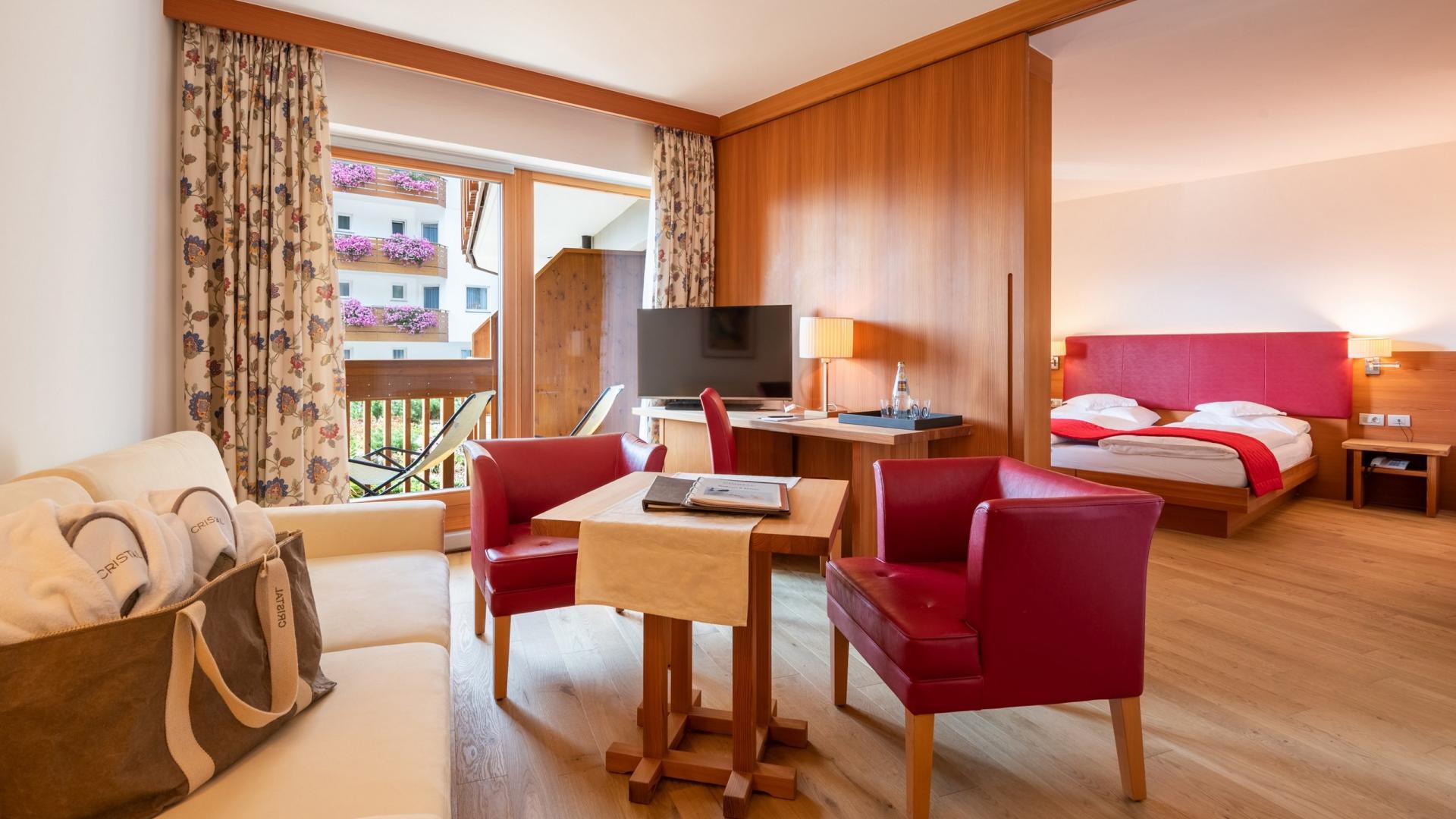 Stanza da letto e soggiorno in legno di larice, di circa 44 m²: 2 bagni separati, bidet, TV satellitare a schermo piatto, telefono, bollitore in camera, cassaforte, balcone, WiFi e parcheggio interrato.