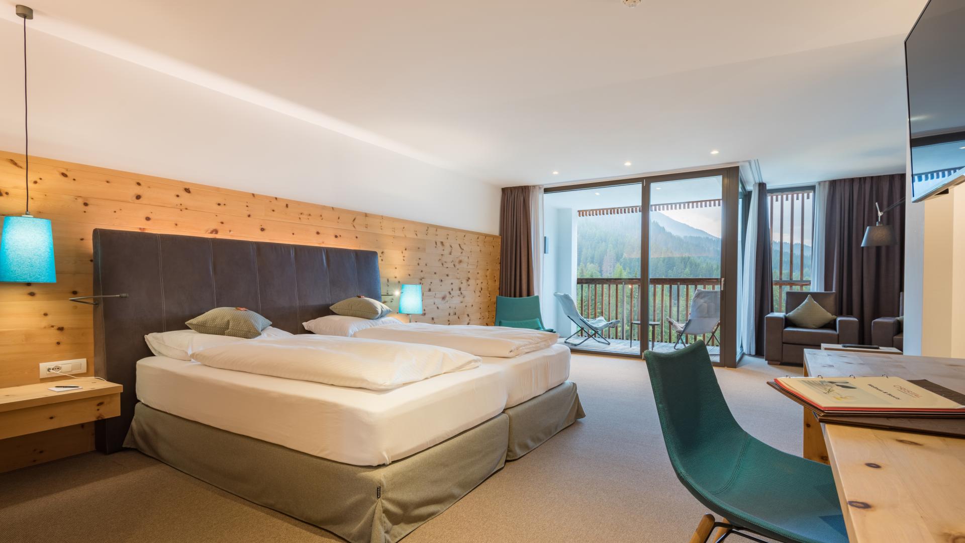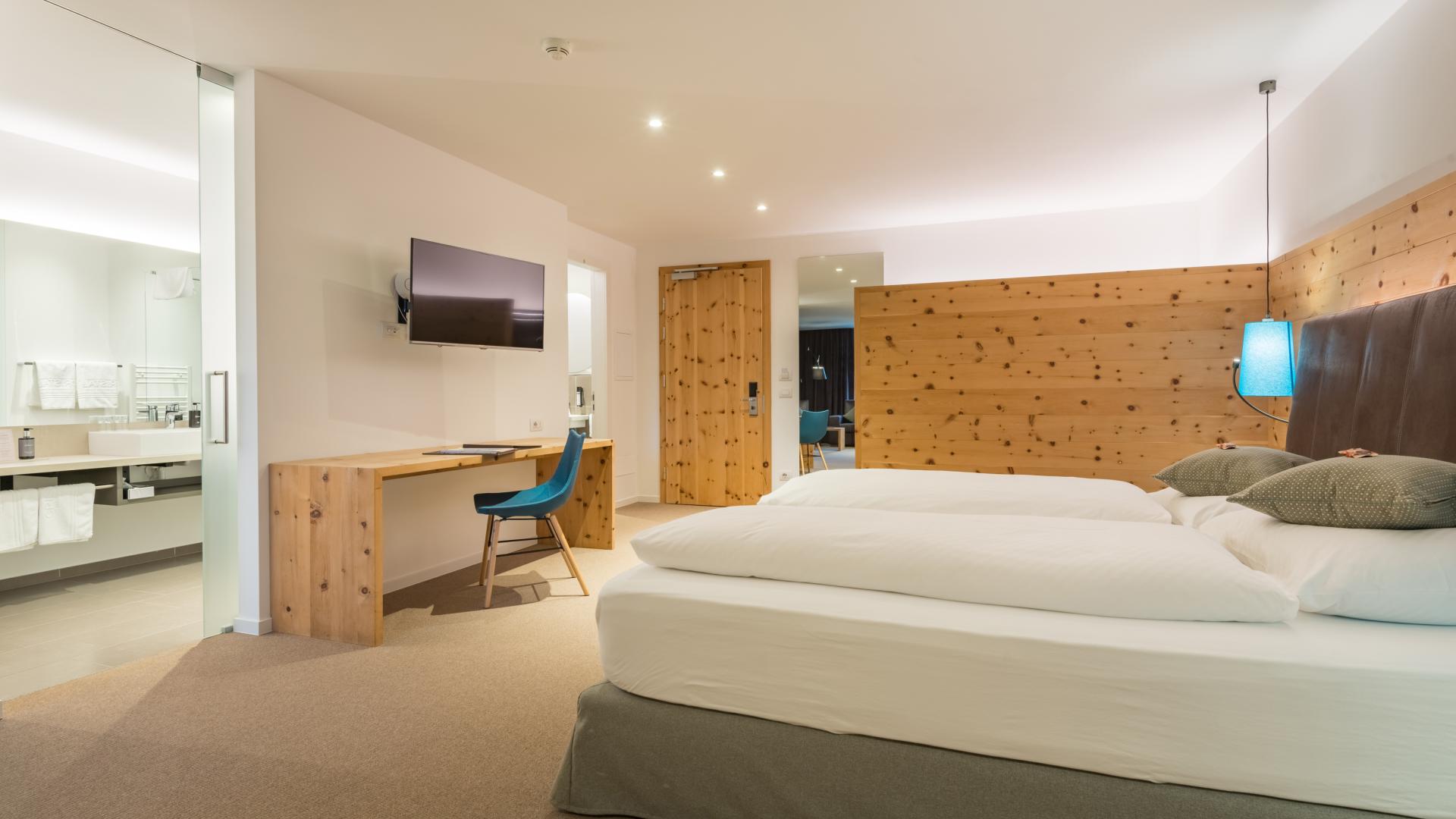 Großzügiges Zimmer in Lärchenholz mit ca. 40 m², 1 Badezimmer und separates WC, Dusche oder Badewanne, Bidet, Flat-Screen-Sat-TV, Telefon, Wasserkocher im Zimmer, Safe, Balkon, WLAN und Tiefgaragenparkplatz.
