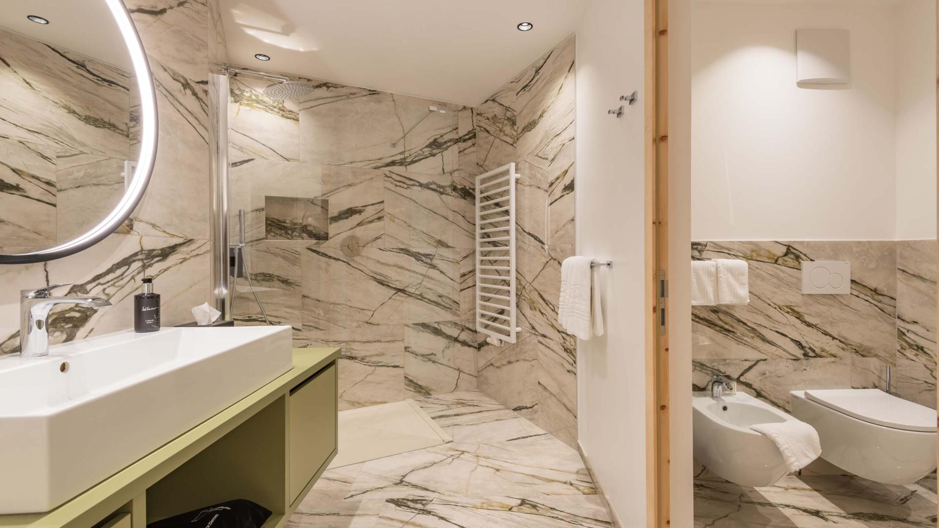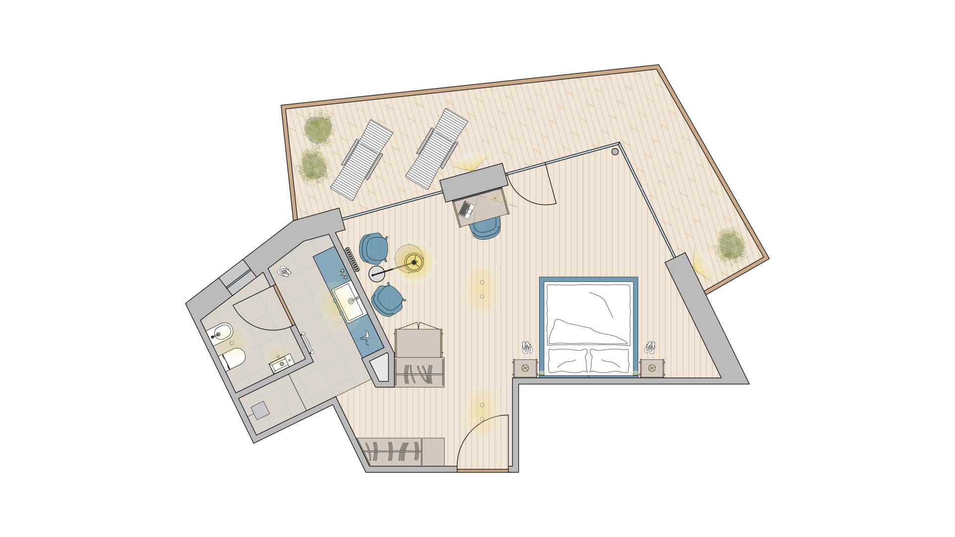 Suite mit ca. 45 m², 1 kombinierter Wohn- und Schlafraum, Badezimmer mit Regendusche oder Badewanne, Badezimmer und Toilette getrennt, Bidet, Flat-Screen-Sat-TV, Telefon, Safe, Espressomaschine und Wasserkocher im Zimmer, Panorama-Loggia Richtung Südosten, WLAN und Tiefgaragenparkplatz.